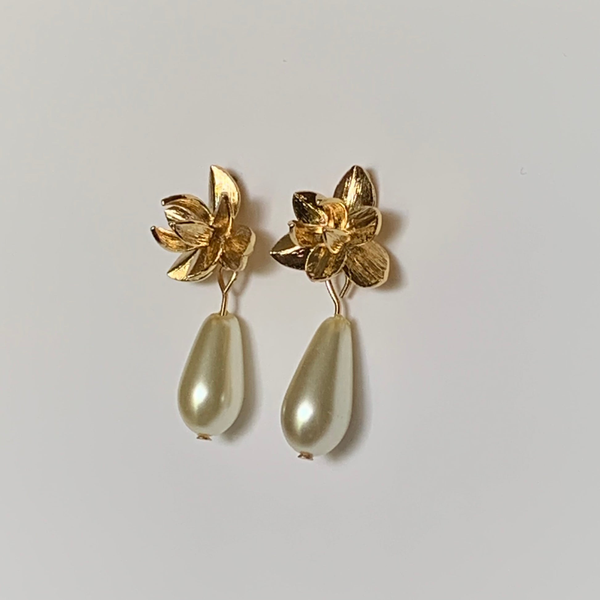 Explore the simple beauty of these Magnolia Teardrop Pearl Earrings. They feature intricate gold flower designs and teardrop pearls that exude elegance and charm. Elevate your everyday look or add a touch of class to a special occasion with these stunning earrings. A must-have for any jewelry collection.